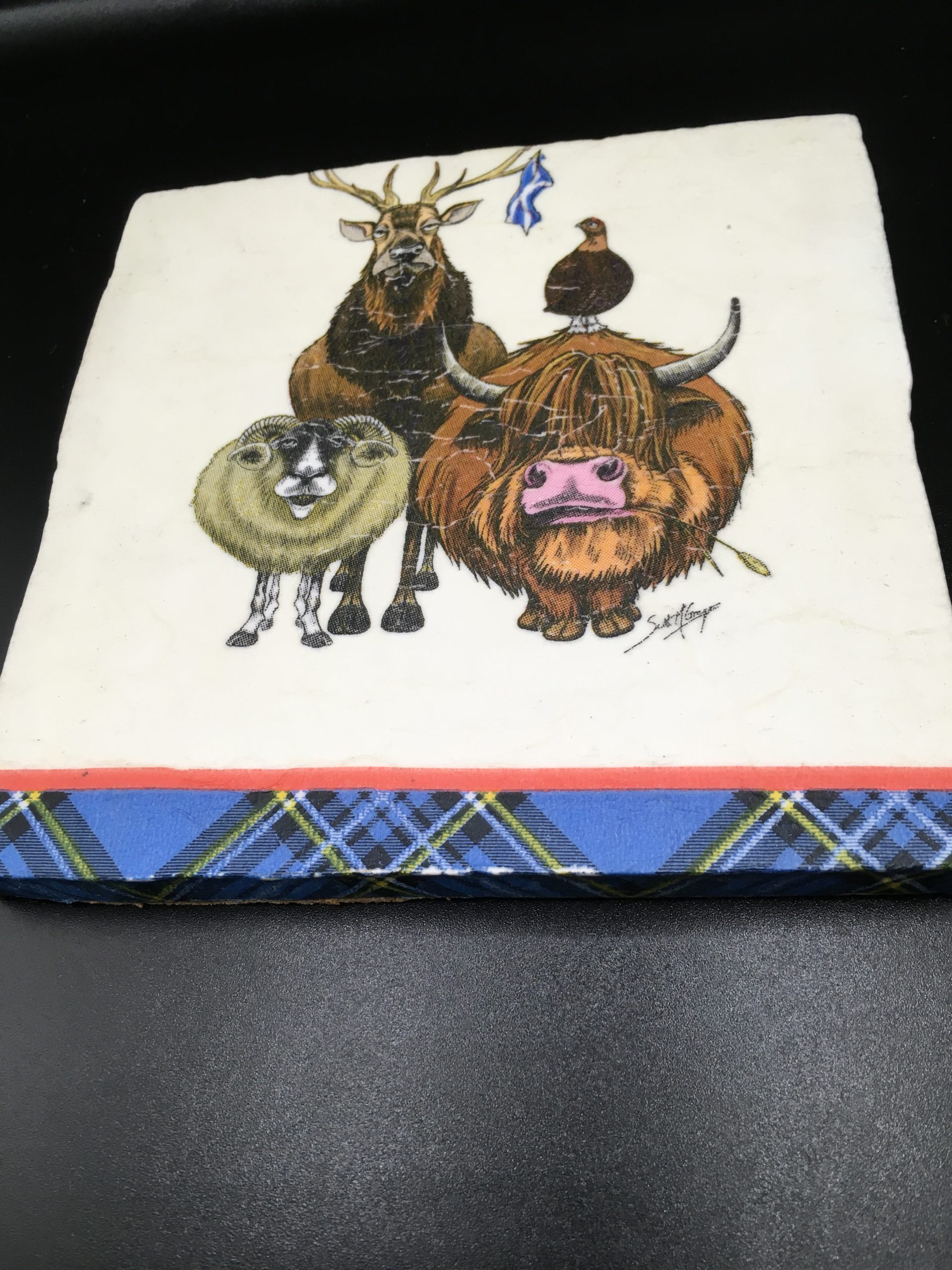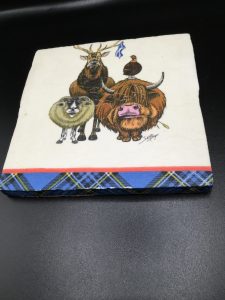 Single large chunky hand made coaster, featuring Scottish animals 13 cm x13 cm . Comes wrapped in tissue with ribbon.