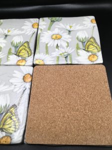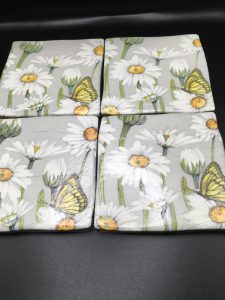 Set of four handmade ceramic daisy coasters with cork back. Comes in tissue and ribboned gift box.