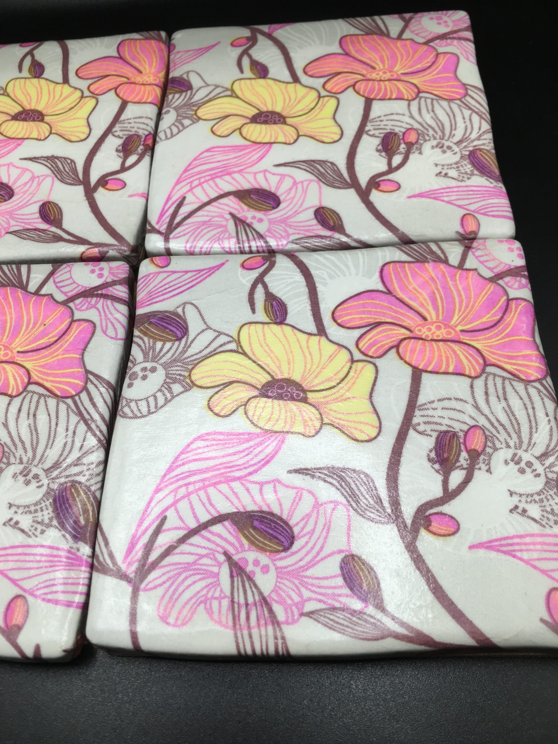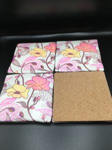 Set of four hand made flower design ceramic coasters . 10 cm x 10 cm. Comes in tissue and ribboned gift box.