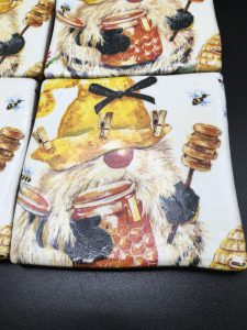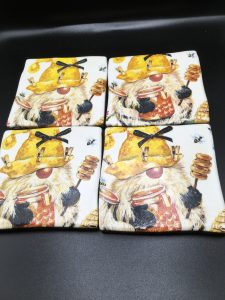 Set of four hand made ceramic gnome coasters with cork backing . Come in tissue and ribboned gift box.